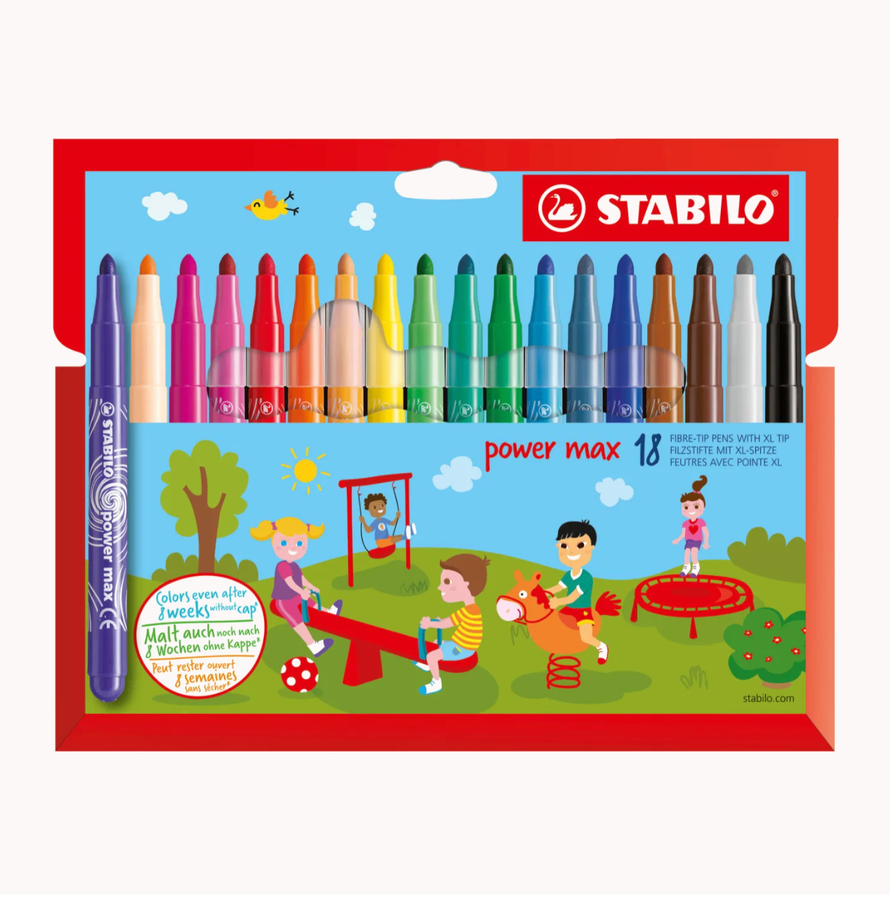 The STABILO power max does not dry out for up to 8 weeks without a cap. Its thick XL tip is particularly suitable for large areas and is not crushable. The ink is washable. The STABILO power max is available in 18 intense colours.