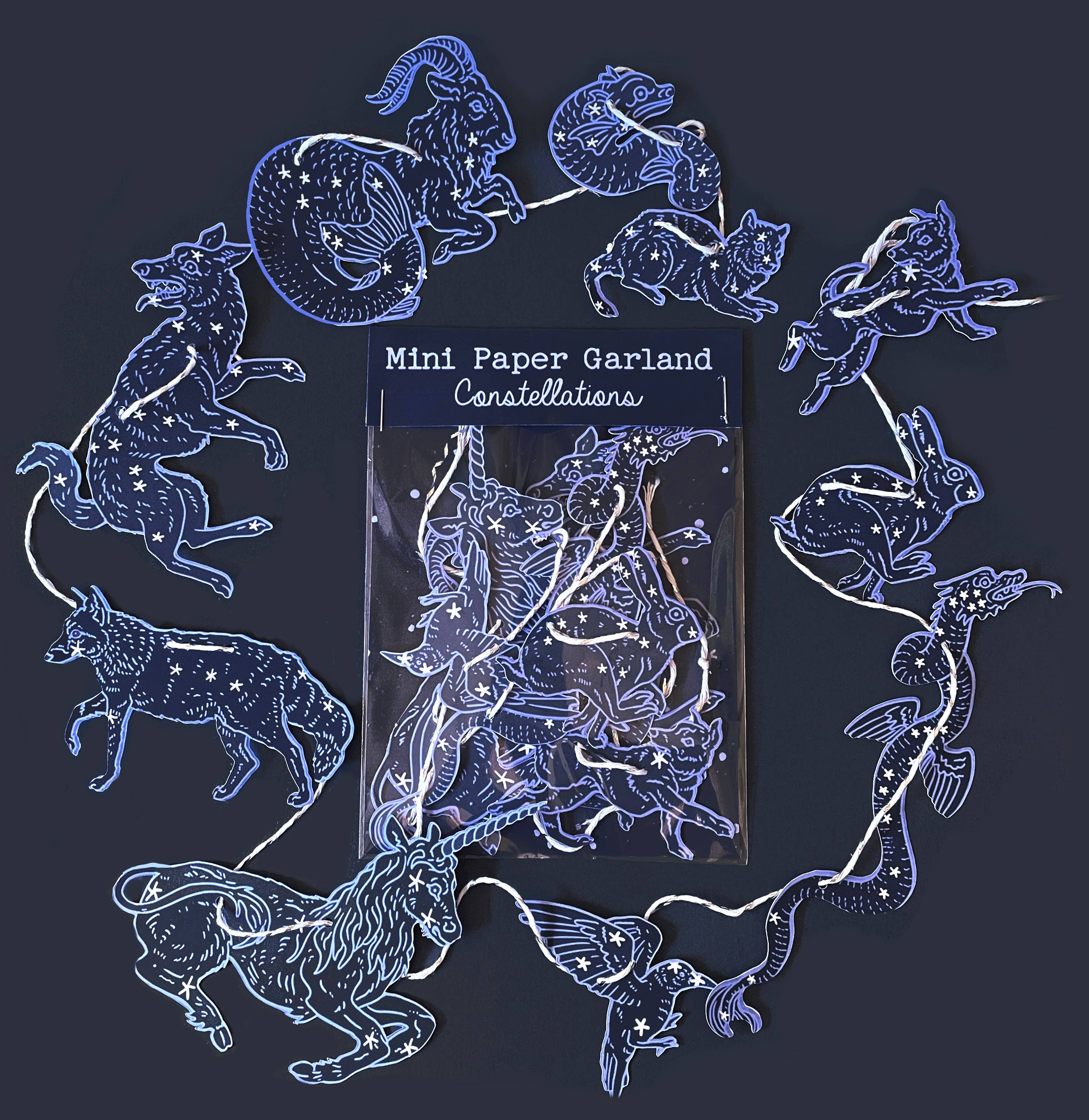 This paper garland is approximately 4 ft long, and features constellations from our night sky. At a packaged size of around 4x6 inches, these make great mini souvenirs, and can even be sent in a card! It is recommended for indoor use only, and gentle care is recommended when unravelling and hanging. Printed on one side, string colour may vary. The constellations featured are Capricornus, Felis, Canis Minor, Canis Major, Delphinus, Hydra, Corvus, Monoceros, Lepus, and Vulpecula.