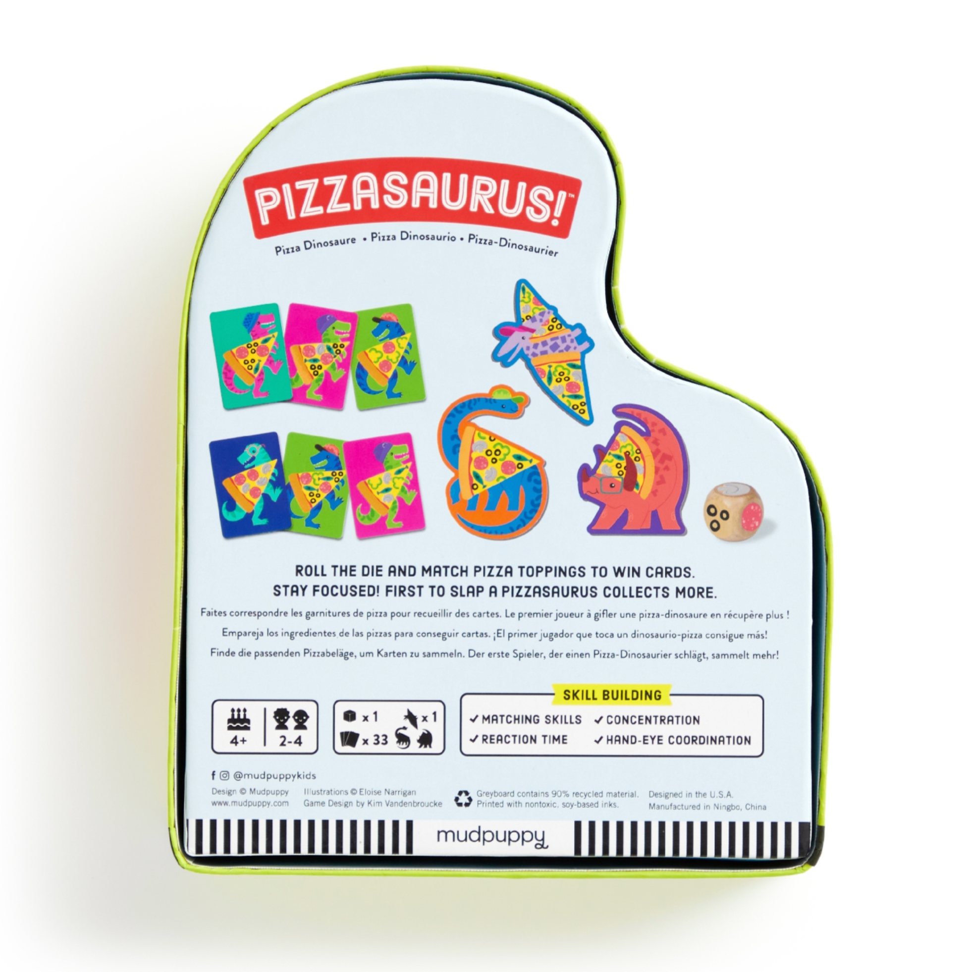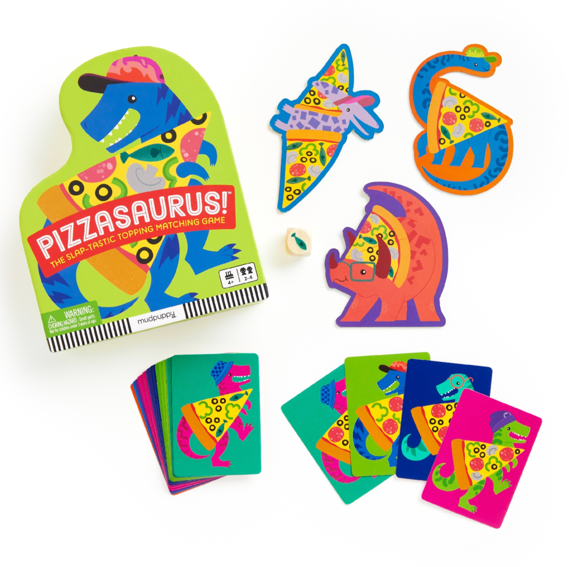 For dinosaur and pizza-loving kids-Pizzasaurus is the slap-tastic topping matching game. This original game for 2-4 players, ages 4+, includes 33 cards, a wooden die, and 3 shaped pizzasaurus tiles. To play, players roll the die and try to match the pizza toppings to collect cards. If a player flips a card that matches a pizzasaurus tile, all players race to be the first to slap the matching tile. This fast-paced and humourous game also has added educational value highlighted on theback of the box, including matching skills, concentration, reaction time, and hand-eye coordination.