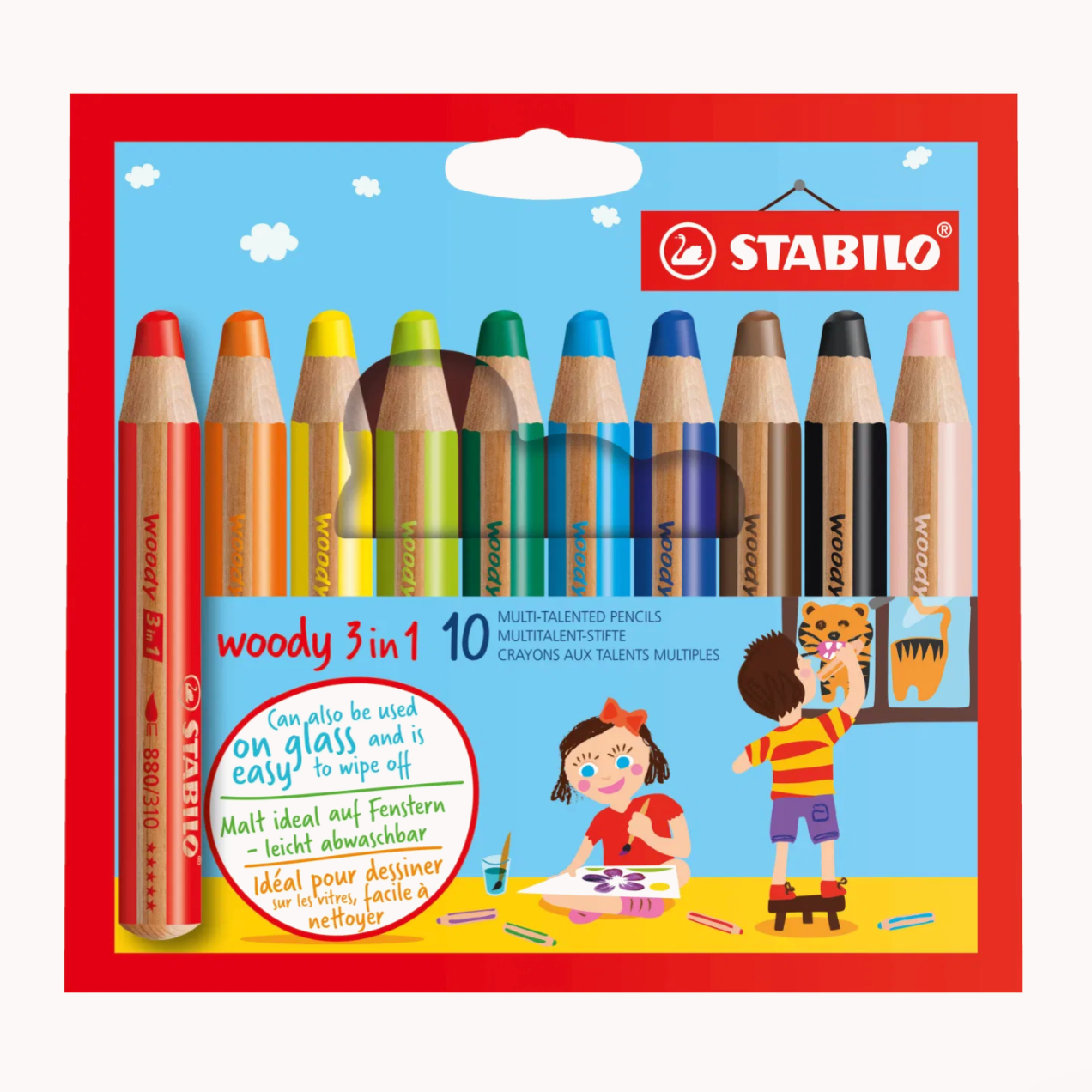 The multi-talented STABILO woody 3 in 1 colored pencil in a cardboard wallet with 10 colors. You can find a list of color names and color numbers under Properties.