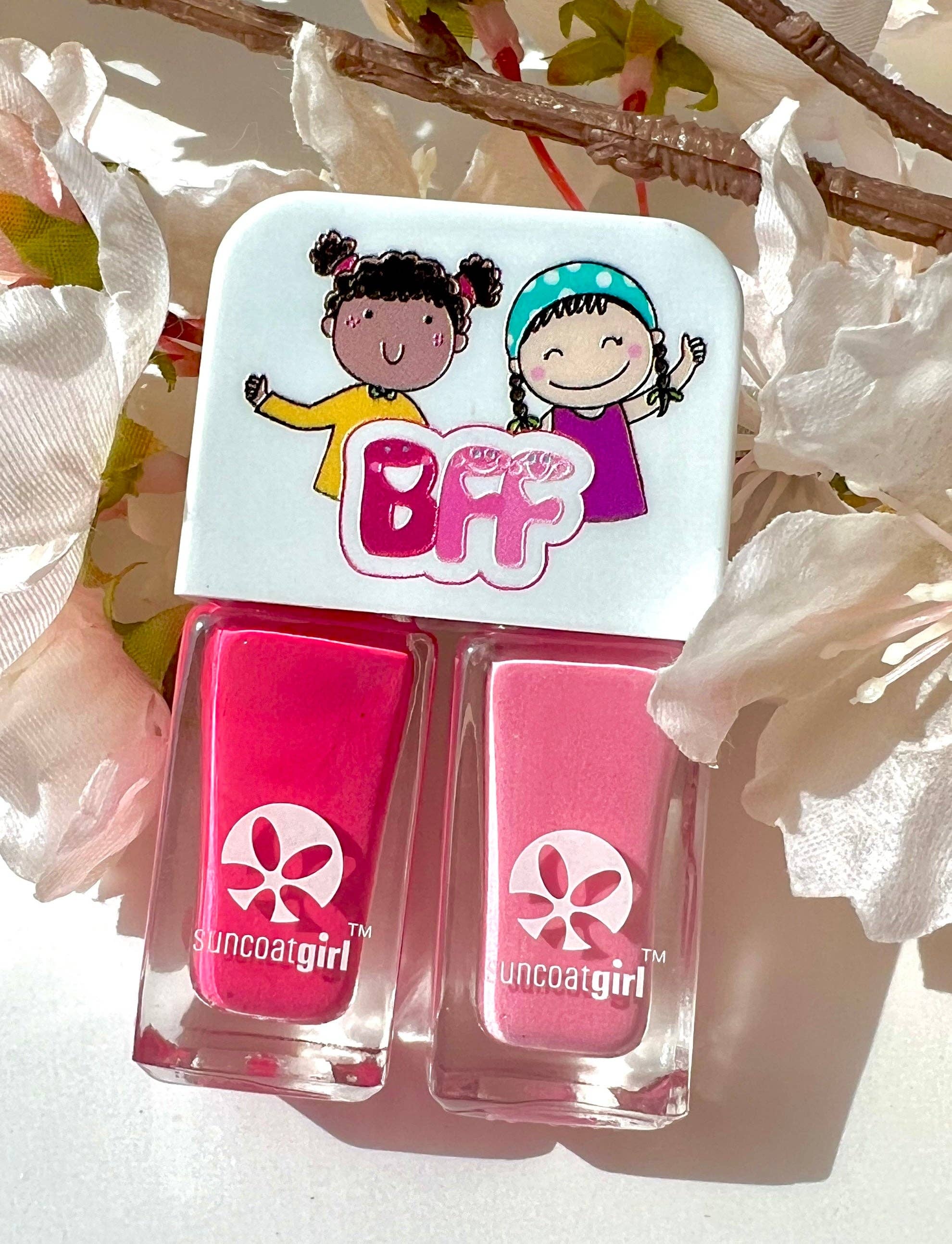 Live your best life in pink with our BFF Set, Pinkies. We've got two pink colors that are highly pigmented (one coat is enough!), and opaque. Water based & peelable. No toxic chemicals. Only water evaporates into the air when applied, no chemical fumes. Virtually odorless. Dries fast & durable. Can last for days on fingernails, weeks on toenails. Easy to remove, no nail polish remover is needed. Non flammable, safe to travel with. For children 3 years and older. Use under adult supervision. Made at the brand's facility in Guelph, Ontario, Canada Size: 2 x 5ml / 2x 0.17oz / ea.