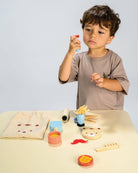 A drawstring bag to hold all your shaving, trimming and styling products. Using the little bear mirror, soap up your cheeks with some bear shaving cream, shave, trim your beard with the handy scissors, add some beard balm, a squirt of cologne, and a flick of the comb in the hair and you are ready to go out! Don’t forget the pretend moustaches for a quick disguise! Pretend play and fine motor skills.