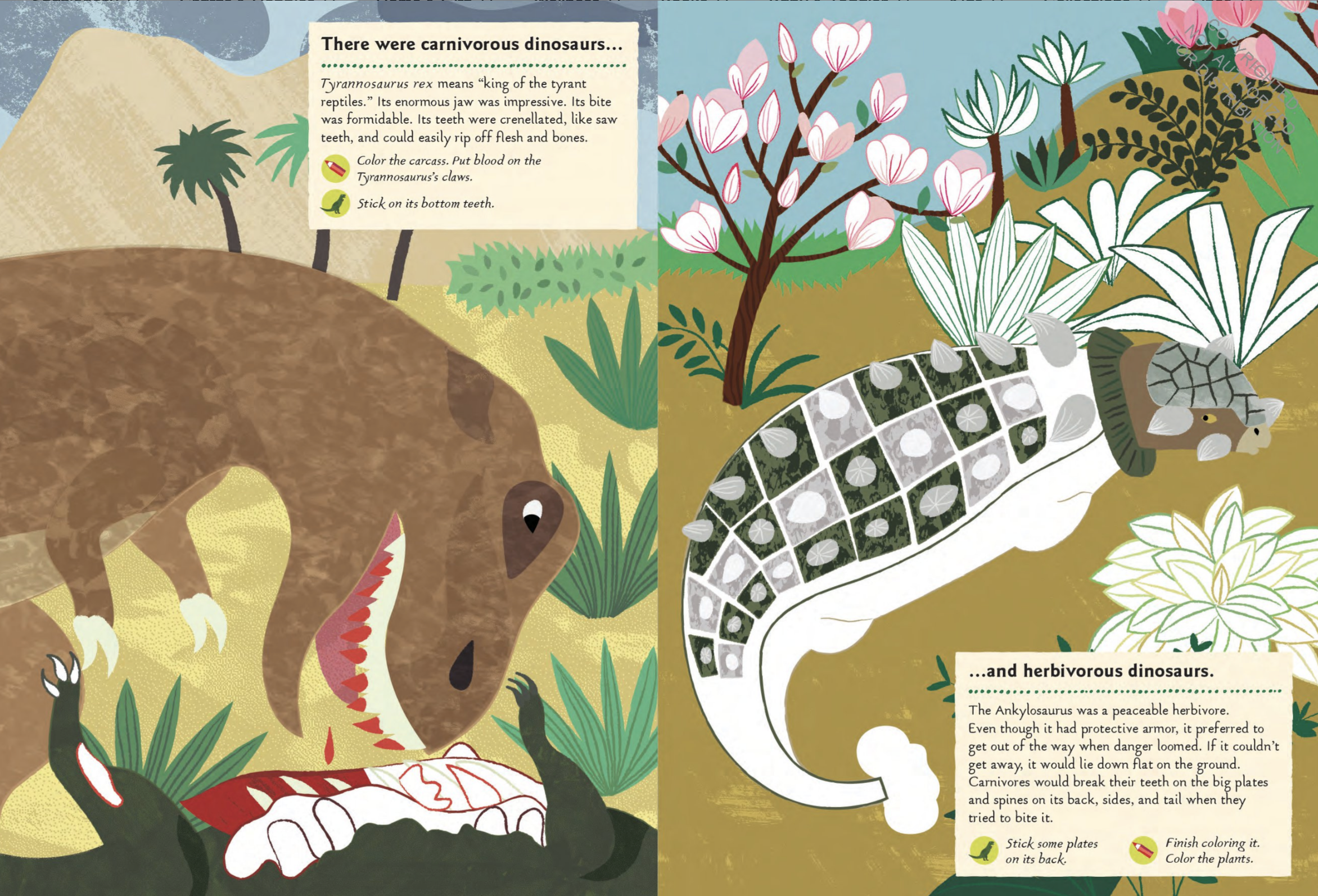 In the Age of Dinosaurs will answer all of these questions and many more, presenting a range of interactive activities, stickers, and fun facts for children. Lovingly illustrated by Olivia Cosneau, this book introduces children to the world of dinosaurs and keeps them entertained for hours through fun activities, such as sticking on the missing bottom teeth of a Tyrannosaurus rex or coloring in the back plates of a Stegosaurus. In the process children learn about the different types of dinosaurs that existed, their diet, how they hunted, how they protected their young, and other interesting facts. A quiz at the end of the book tests their knowledge."