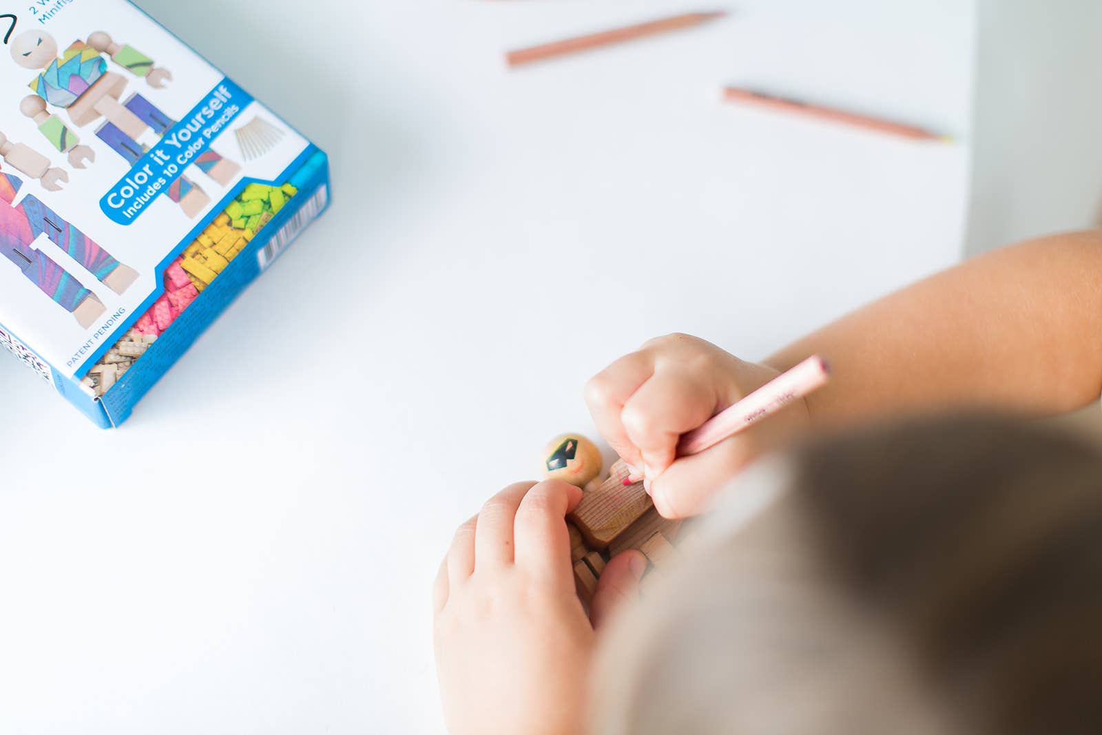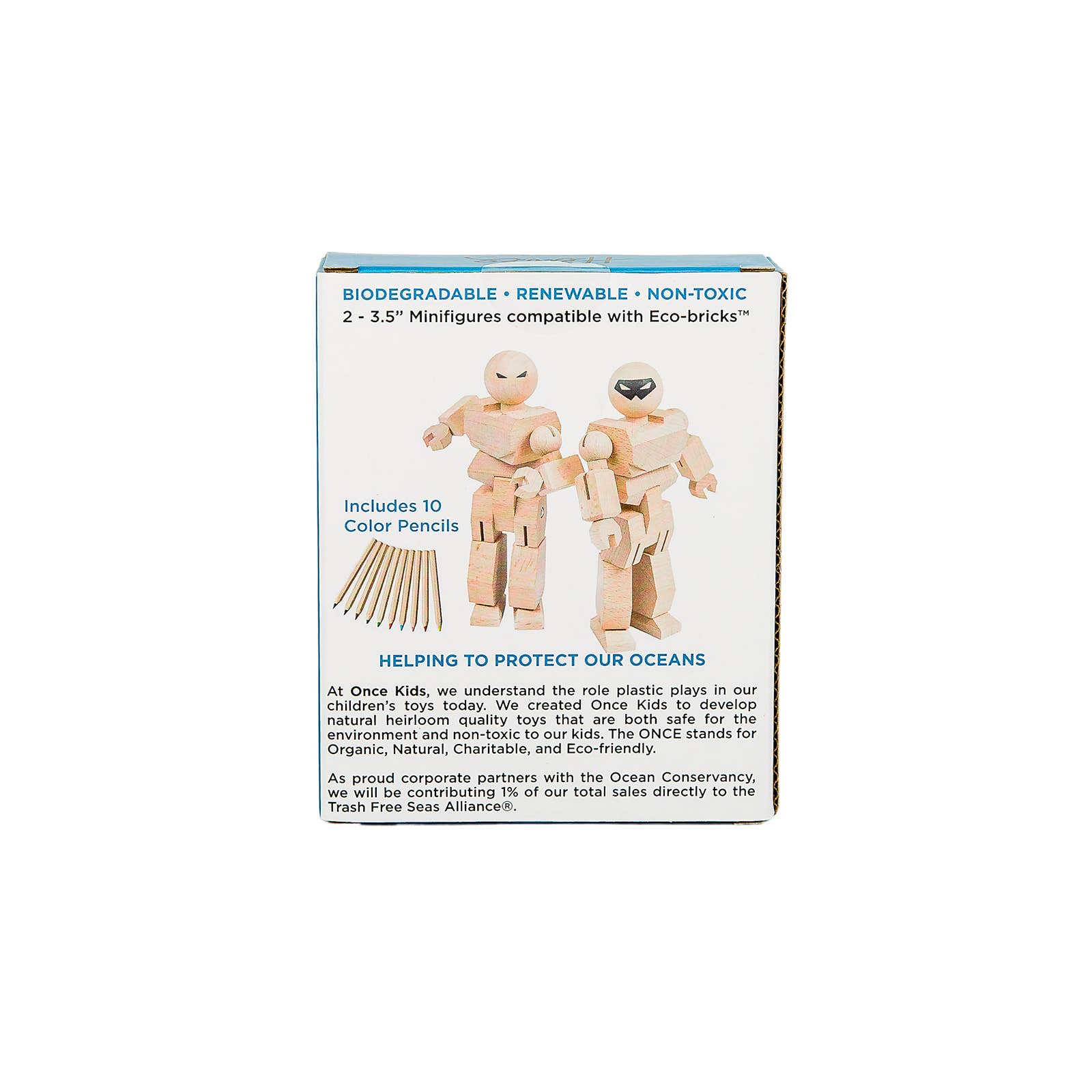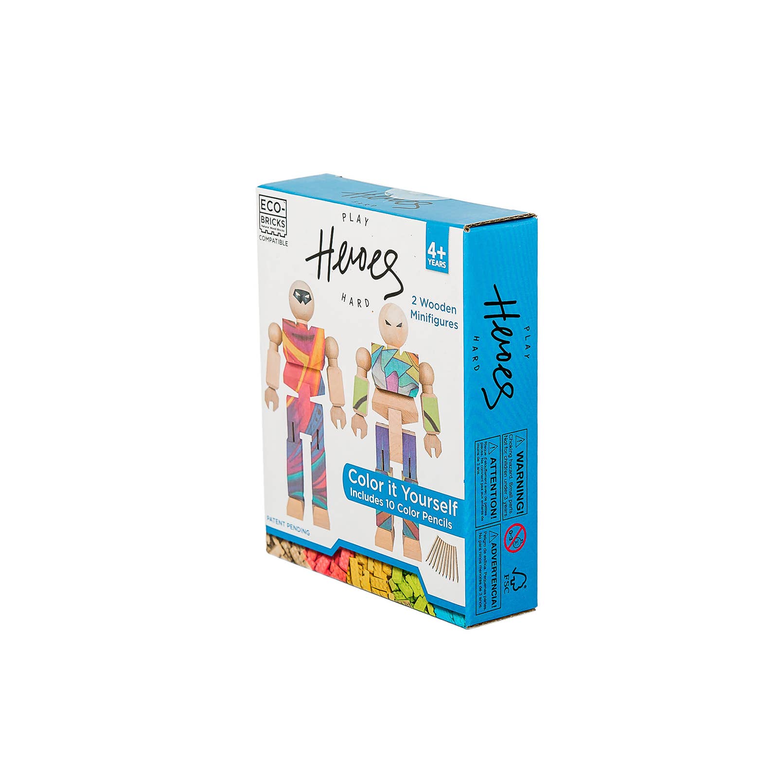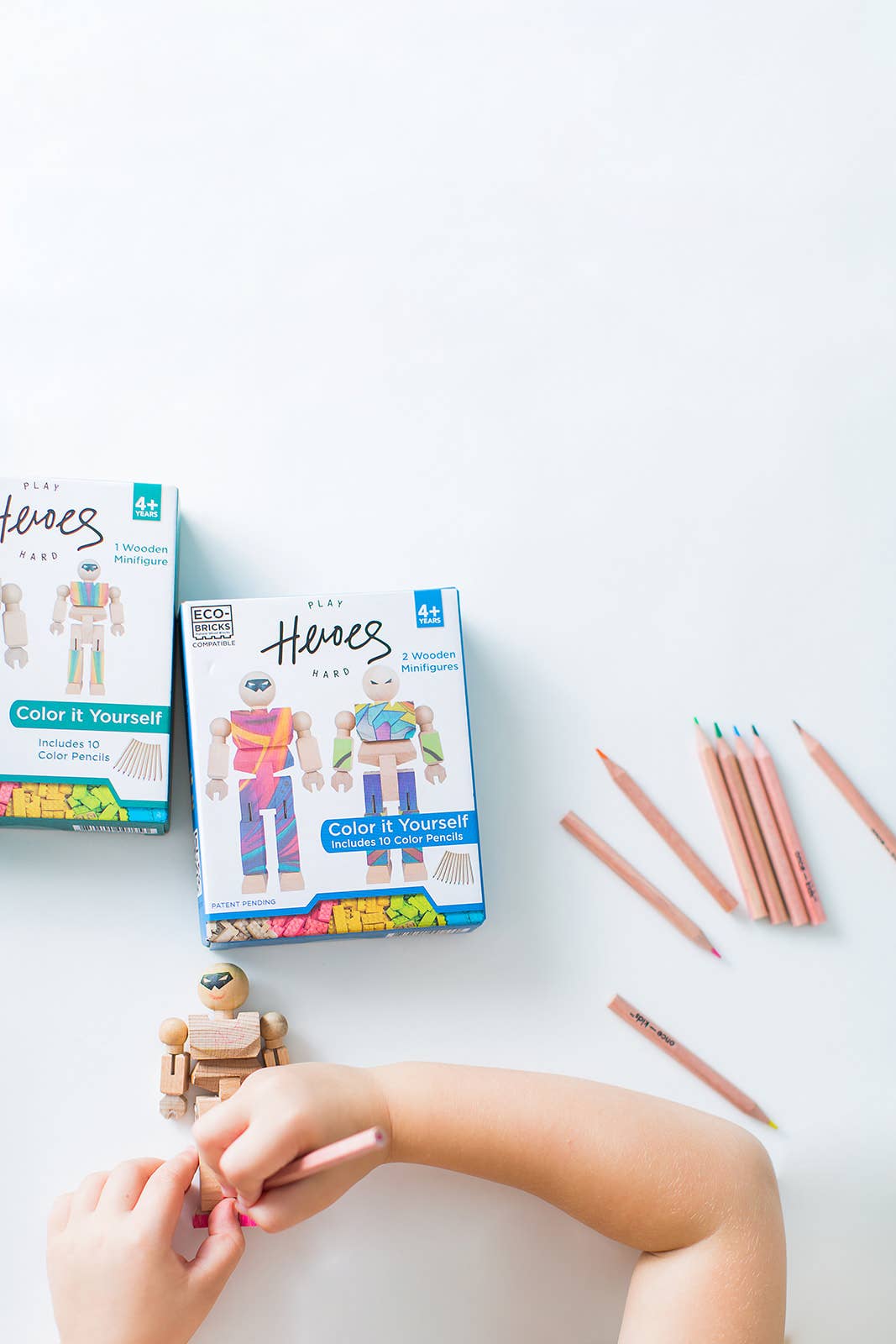 Playhard Heroes DIY Mini-Figure is a natural and biodegradable wooden action-heroes. Made entirely of strong wood with articulated sections connected by elastic string and metal joints, these playtime heroes have what it takes to stand up to whatever super villains come their way. To look the part - grab the 10 included color pencils, design and decorate your hero's costume, and watch their heroic journey begin! Benefits: Exceptionally strong materials for lasting durability. Encourages creativity, imaginative play, and storytelling. Bring to life your own custom superhero story! Features: Wooden articulated action figures with blank surfaces for coloring. Fully adjustable body connected by elastic strings and metal joints.